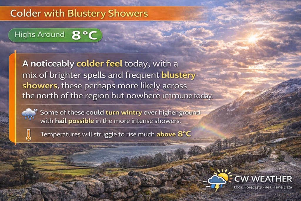 wintry over higher ground. Skies will turn cloudier overnight as