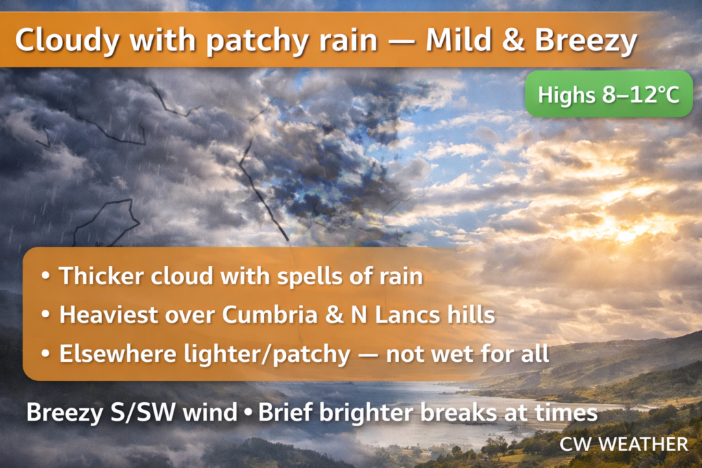 A cloudy start with rain across Cumbria and coastal stretches of the region.