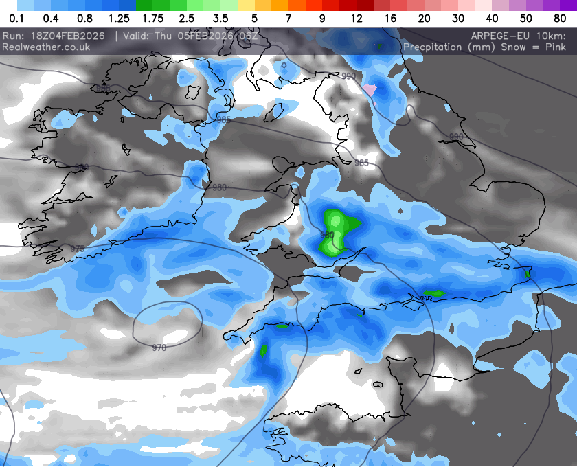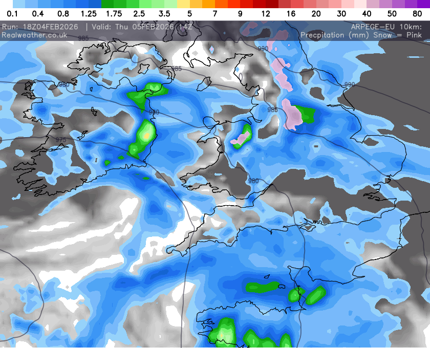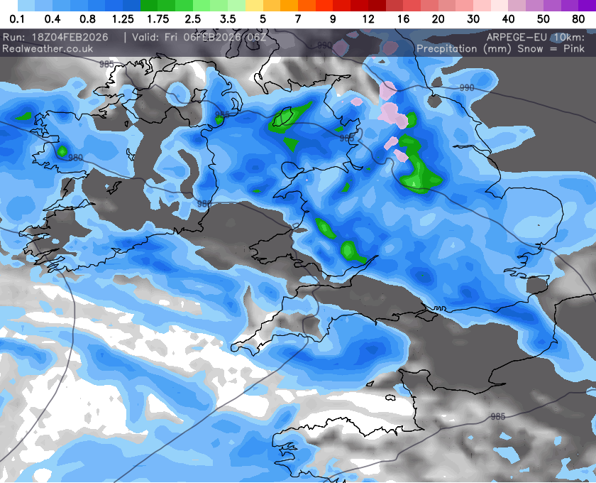Thursday looks grey and unsettled. A band of rain pushes northwards through the day, bringing heavy and prolonged downpours in places, along with some snow over the hills. Strong winds are likely to persist, adding to the cold feel, with daytime highs only around 6°C.